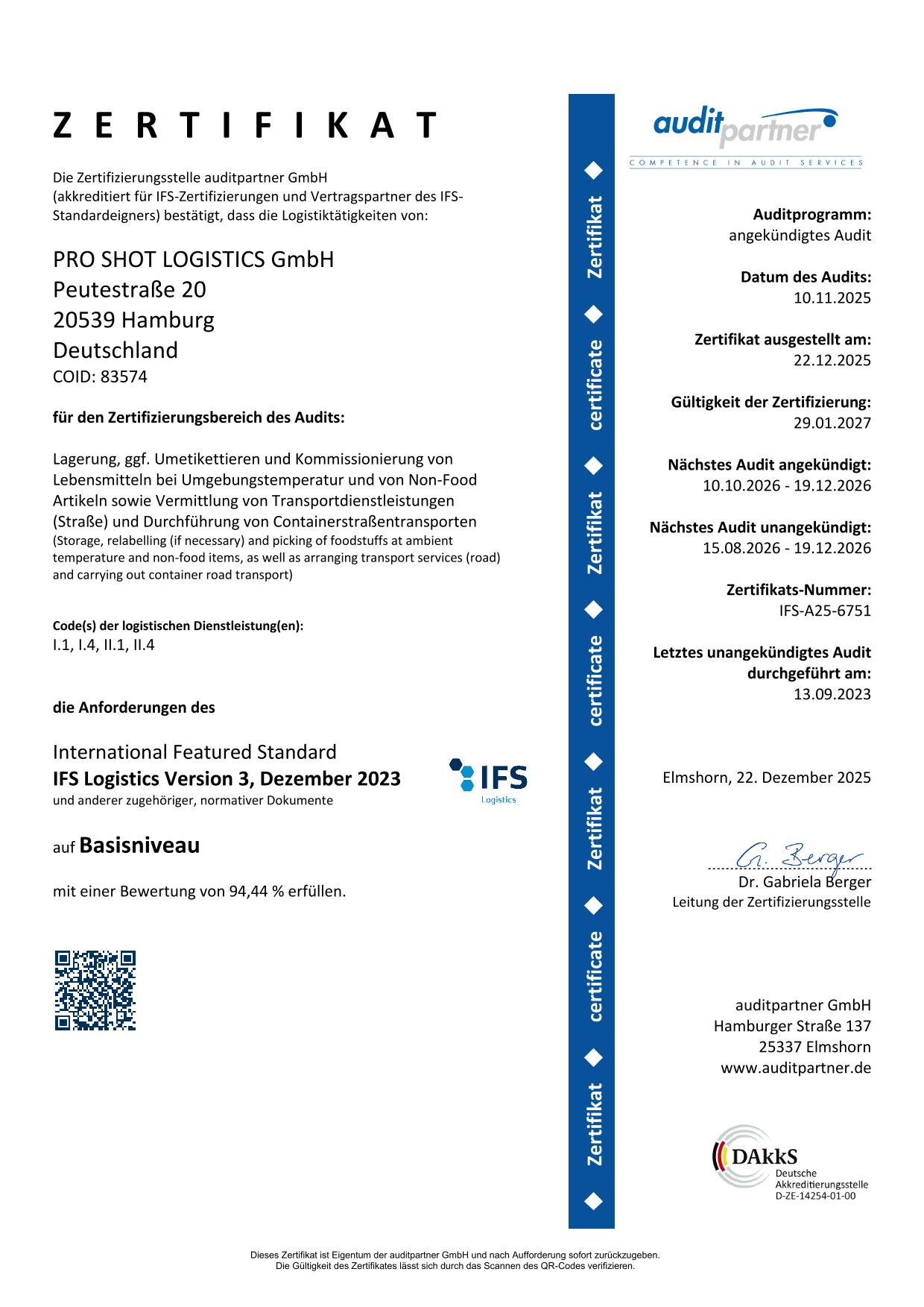 Wir setzen auf die Erfüllung des hohen Qualitätsstandards IFS Logistics