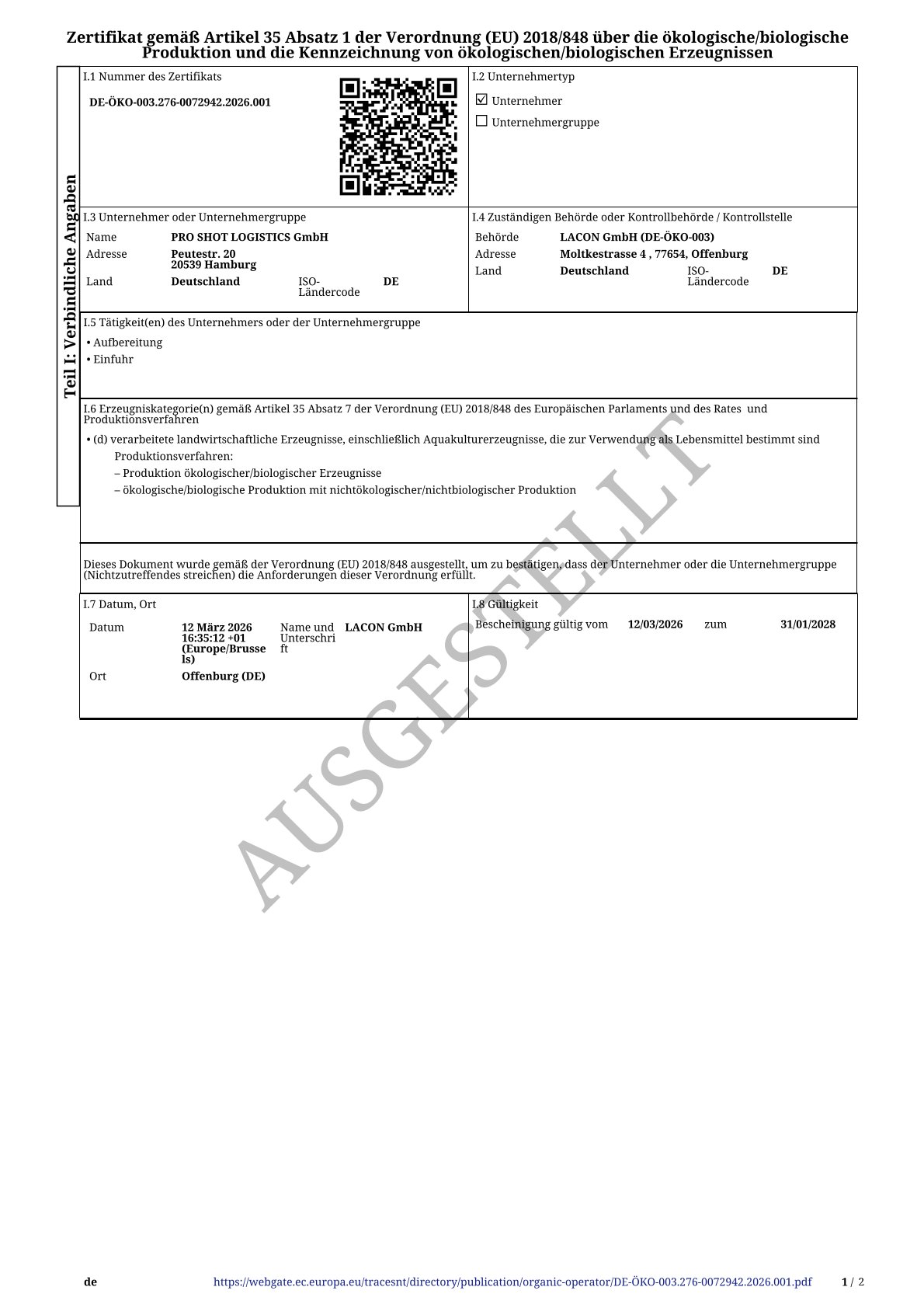 Der internationale, GFSI anerkannte Standard IFS Logistics findet bei PRO SHOT LOGISTICS Anwendung. Die Anforderungen und Vorschriften im Umgang mit Zusatzstoffen für Lebensmittel und „non food“ Produkten halten wir zuverlässig und nachvollziehbar ein.