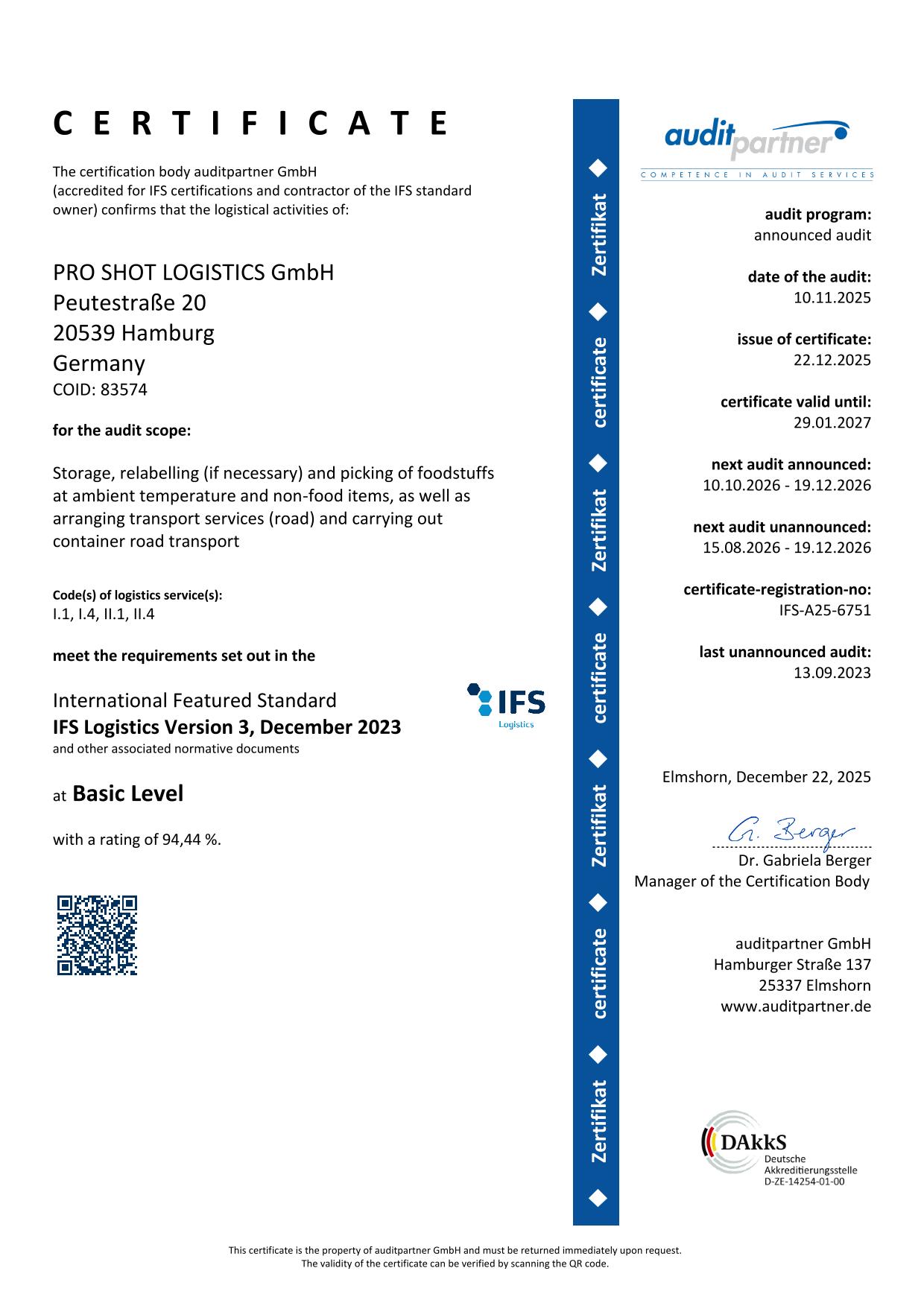 The international, GFSI-recognized IFS Logistics standard is applied at PRO SHOT LOGISTICS.  We reliably and comprehensibly comply with the requirements and regulations for handling additives for food and non-food products.